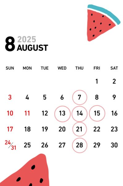 8月の営業案内です! お盆は13日(水)14日(木)15日(金)となります あとは木曜定休となりますのでよろしくお願い致します🌻